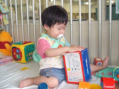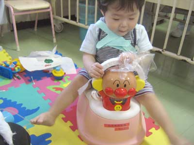 今日はおマルの練習。 とりあえず、乗るだけね。 |