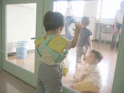 ガラス越しに、未知との遭遇。 感染の危険が高まるので、 素性(感染の有無)のわからぬ他の子とは、 一緒に遊べません。 ルートも心配だし。 |