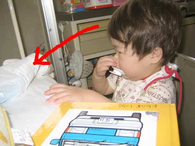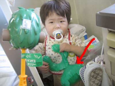 嫌がったモリゾーのおもちゃ、 それでも、 「これでしょ?」 と同じキャラのオモチャを持ってきました。 |
