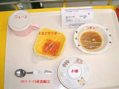 今日のメニューは、お粥・トマトサラダー、シチュー・ジュースでした。