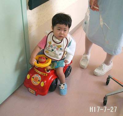アンパンマンの赤い足こぎの車をナースステーションから借り出してやると大喜び。