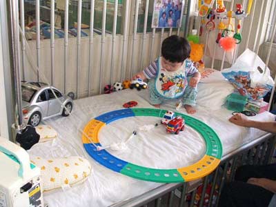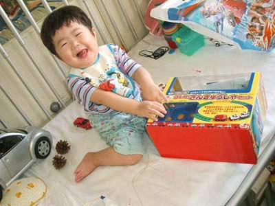 ババが面会簿に記帳する間、ベッドから手を振っている孫が見えた。