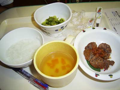 メニューはお粥、ハンバーグにブロッコリー、スープ。