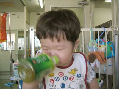 散歩の後は、コレだよな。 ペットボトルで飲む振りをする。 当然まだ一般の飲み物は許されておりません。 |