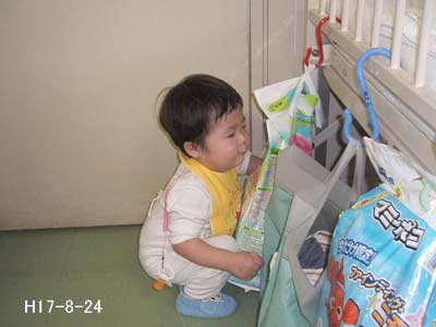 そろそろオムツも替えてもらお! そんなに大人しいヤツだったか?! 怪しいなぁ・・・。 |