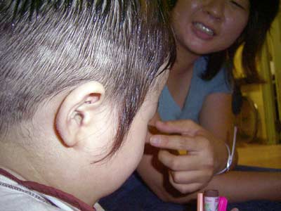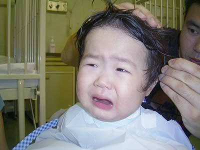 息子は何故かイヤイヤするが、エプロンを切って手を出してやると、落ち着いた。