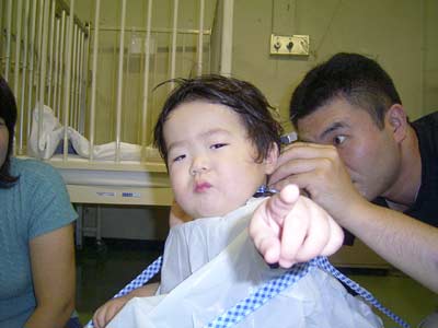 これで髪型わかるでしょうか? もみあげは伸ばします。 退院が先か、アゴ下で結べるのが先か。 |