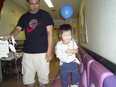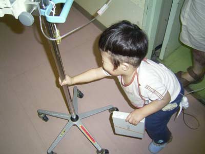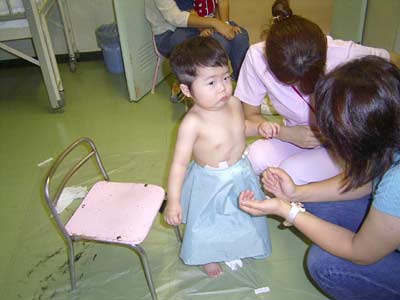フラダンスのような、化粧回しのような・・・。 大事なIVHを守るため、最近入浴時に着用しているようです。 しかしこの後、ちろちろと音が・・・ 息子なりにオシッコ我慢していたようです。 |