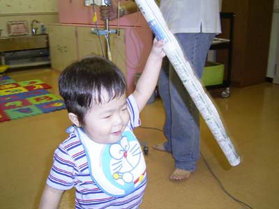 新聞を丸めた棒で、剣道ごっこ?