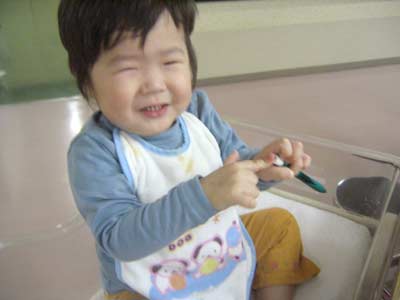 あっという間に7時半。歯磨きして、お着替え&オムツ替え。