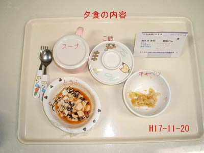 夕食は「ご飯・スープ・キャベツ・豆腐」でした。