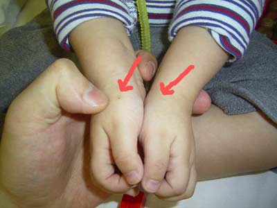 イタイのどこ?と聞くと、 ココ! と手を出してきました。 右手のは先日の末梢点滴、 左手のは採血の痕でしょうか。 |