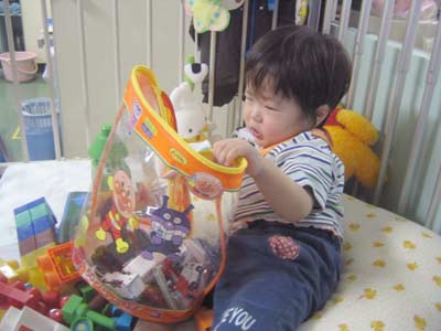 どうも交わらず一人でもくもくとウレタンパズルを運んで遊ぶ。