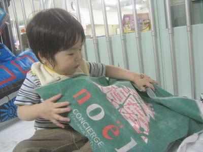 配膳の方から、プレゼントが。 「ツリーがあるので、早めに」 との事でしたので、早速息子に渡します。 |