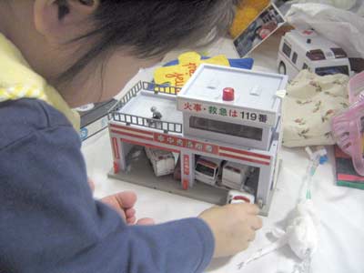 消防署に救急車などを入れて大喜び。