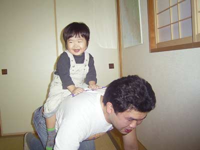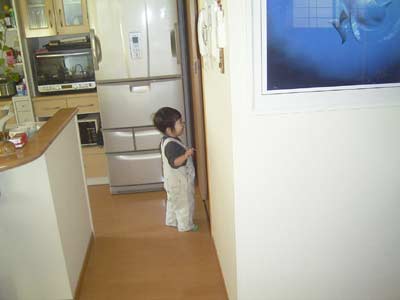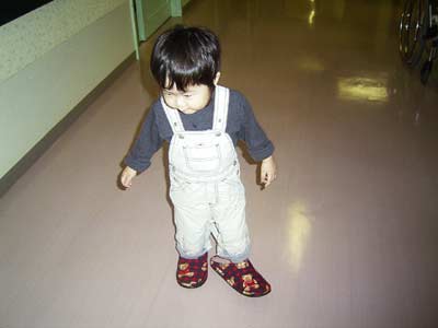 どうしても、ママのスリッパを履くときかない。 パタパタと足踏みし楽しそうだが、 どう見ても歩きにくそう。 |