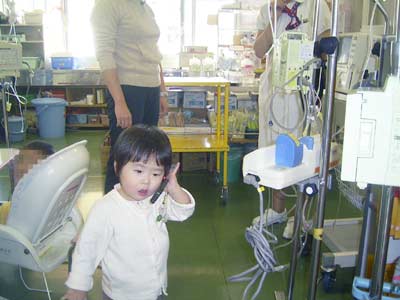 点滴台がないので、小さな息子は何処にいるか見失います。