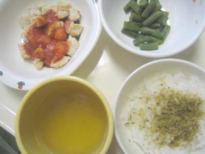 ・メニュー:軟飯・スープ・鶏肉(トマトケチャップ&トマト)・いんげん