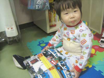 お部屋に戻って遊んでいると、隣の子供の消灯台に置いてある車を取ろうとする。