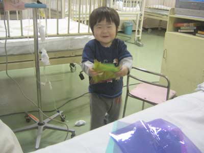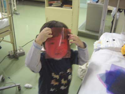 持参したセロハンの透明折り紙で一人で遊んでいた。