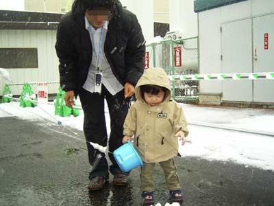 急遽雪を取りに行くことに。 寒くて嫌がる軟弱息子。 |