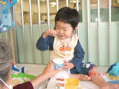 ヨーグルトは紙カップを持っていてやればスプーンを自分で使い完食、