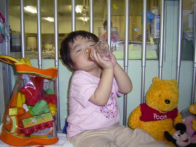 病棟に到着すると、子はナースステーションでバケツ水・氷遊び。
