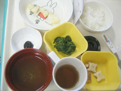 ご飯の形状がUPしました。 魚もほぐしではありません。 野菜もそのまま。 なんたって、おやつにコアラのマーチですよ。 |