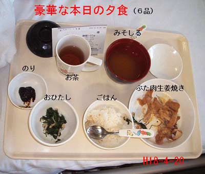 さて、本日の夕食は豪華版「ごはん・みそしる・おひたし・のり?・ぶたにくの生姜焼き・お茶」。