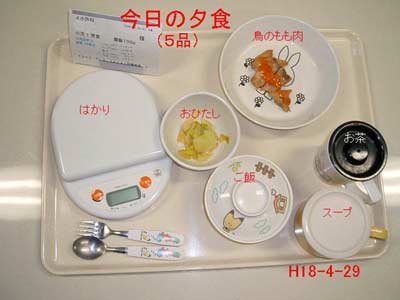 今日の夕食は「ごはん・スープ・鳥肉、おひたし・お茶」の5品。