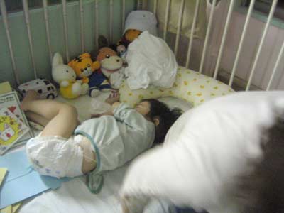 お部屋に戻ると早速、隣のベットのママに昨日遊ばせてもらったおもちゃを要求。