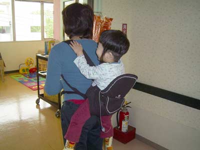 バブ〜! と再び笑顔となる。 こんなに大きくて、おんぶされてる子、 居ないぞ。 |