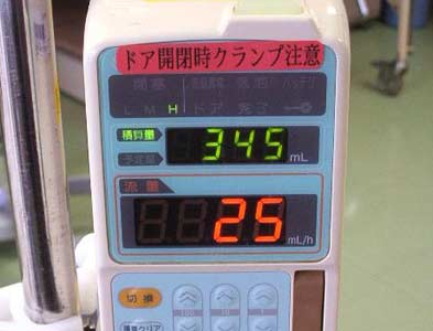 お疲れの腸を休ませるため、今日から夜間の胃ロウが中止となりました。不足するカロリーを補うため、IVHが15→25mlに増量されました。 常に24時間フル稼働でしたから・・・これで変わると思います。 |