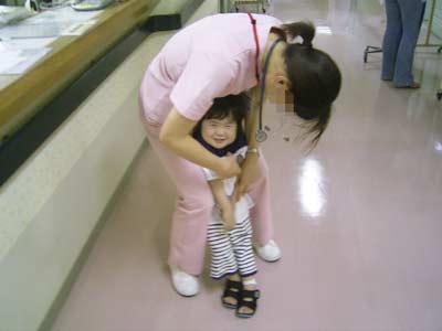 ルートがないと自由奔放。 SWさんに捕らまえられて、体温測定。 |