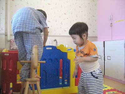アンパンマンのつけて、自分でやるの・・・? 年上の子は、いい刺激になります。 |