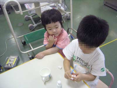 お片づけをしていると、ナースステーションでちょっと上のお兄ちゃんが歯ブラシ中。