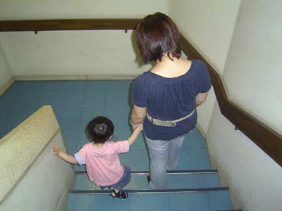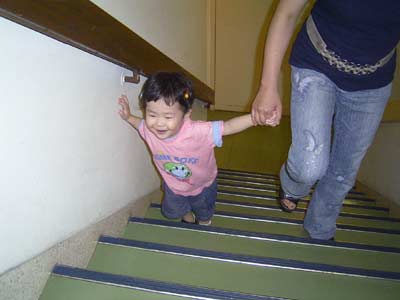 階段も上手に下れるように。 まだ、足は一方だけですが。 |