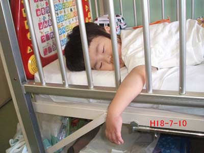 病室に入るとベッドの柵からニョロンと腕を出してリラックスして熟睡中でした。