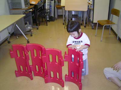 ビデオ見よ〜と、檻のパーツを持ってきて、私たちの前に立てる。