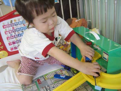今日はベットでトミカのミニカーを走らせて遊んでいた。