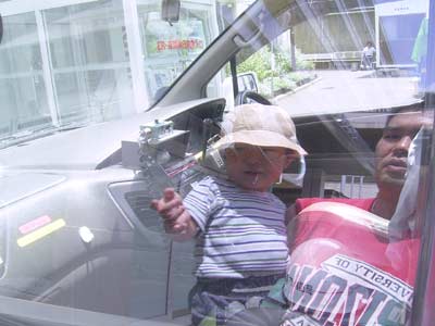 キュッキュの中が見たいというので、 炎天下抱っこ。 暑いです。 |