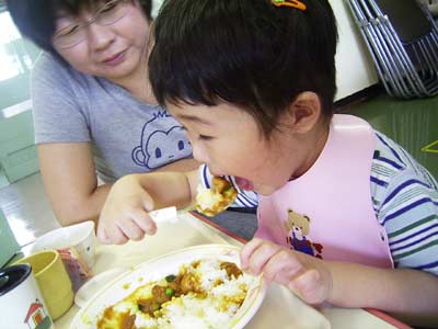 子は自らスプーンに大盛りのご飯を乗せ、更に肉を乗せて口に運ぶ。