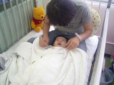 お風呂上がりに、胃ロウのケア。 自分でガーゼを押さえておいて、 「バッテンこんのテープ貼って!」 良く知っています。 |