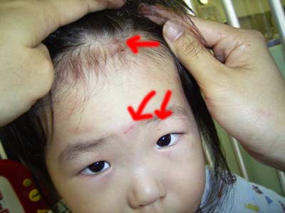 ママが急いで確認する。幸い一見して眉間に血が滲んでいる程度。