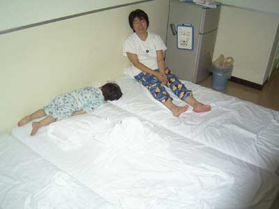 寝にはいると、ゴロゴロ転がり、 結局いつも通り端に落ち着きました。 |