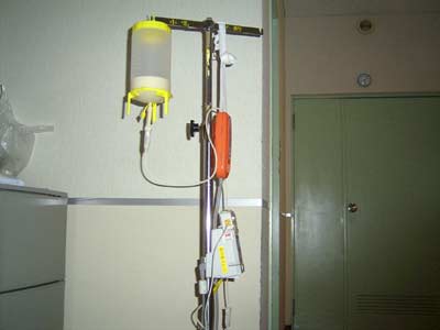 上から、胃ロウ注入液、 加温ヒータ、注入ポンプ。 加温ヒータで人肌程度に温められ、 胃腸の負担を軽減します。 注入ポンプで、42mL/hrが注入されます。 |