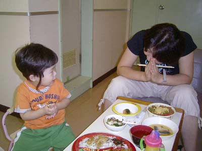 子の食事に、初めて私たちのご飯が並びます。 コンビニ弁当ですけれども。 |