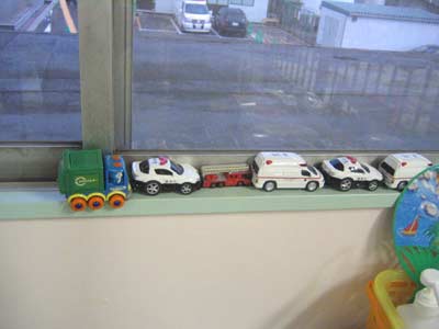 窓際に並べられたミニカー群。 ふと思いつくのでしょうか。 |