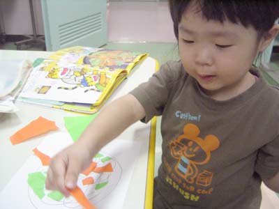 焼きそばの絵に、キャベツとニンジンを貼ります。 |