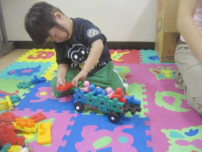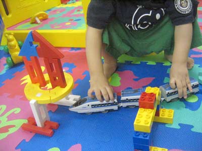最初はブロック遊び。昨日の満員ピンポンバスの続きをする。